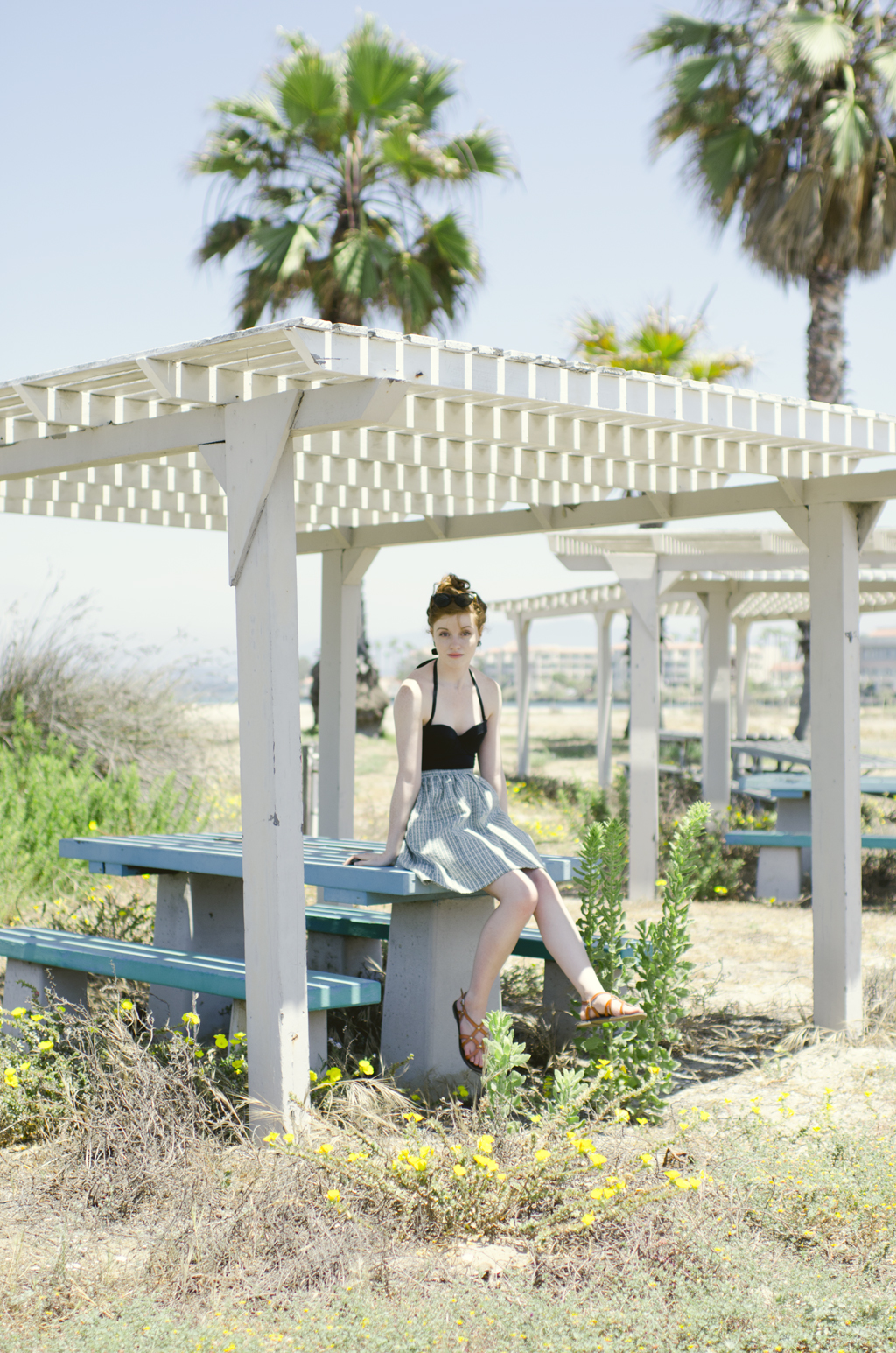 More California pictures! I took these while I was on my way to spend some time at the beach. The resort that I stayed at was over on the bay side, which was about a 10 minute walk from the beach. There's a road and a tunnel that I had to go through to get over onto the beach side. Right before the tunnel there were all these colorful bench tables that was a perfect setting for a photo shoot. As for my outfit, I made the skirt that I'm wearing. It's actually acting as a cover up in these photos, since my top is my swimsuit (I was on my way to go swimming). The skirt is also now for sale in my Etsy shop! If you're interested you can check it out here.